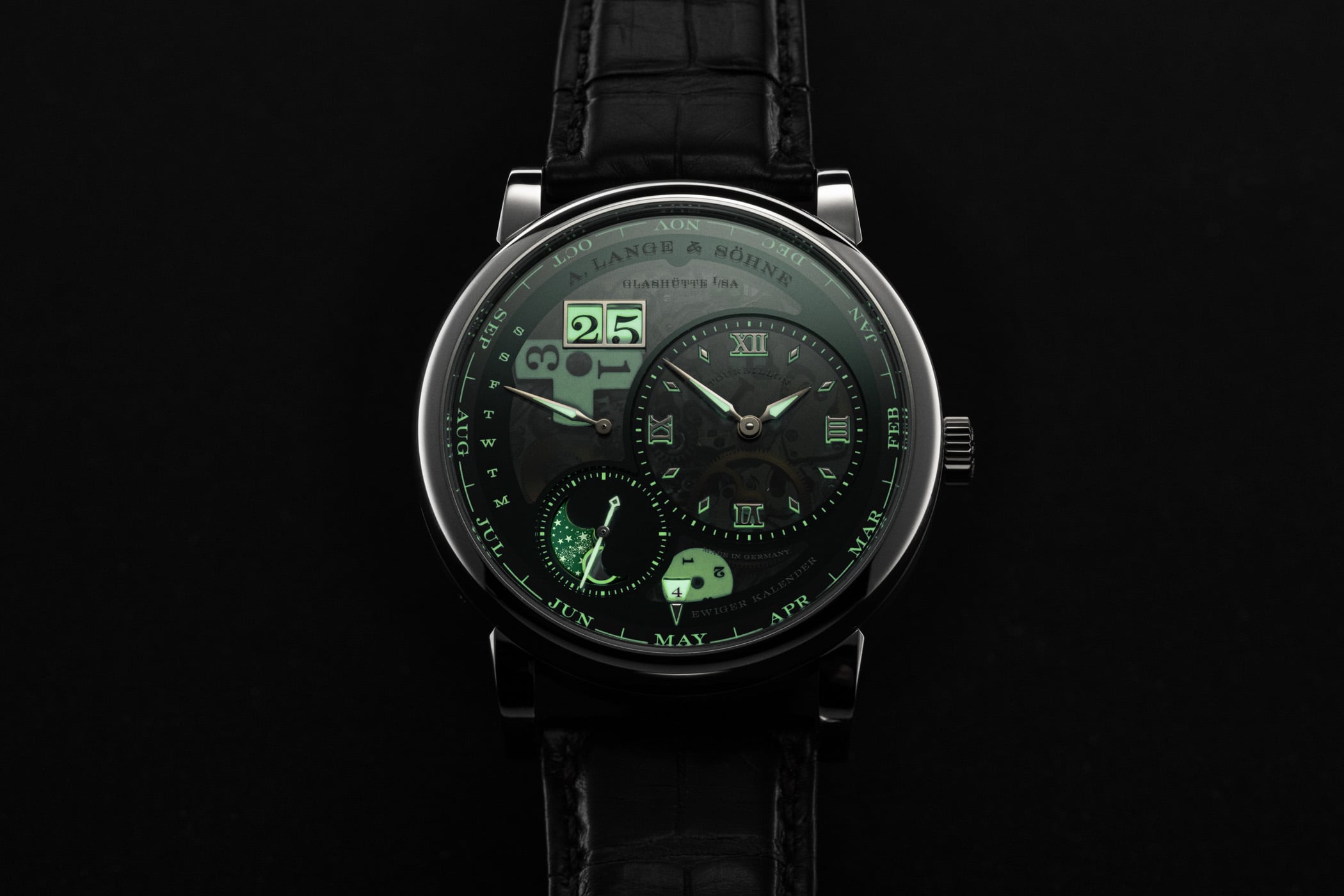 That has one obvious practical benefit and one less obvious one. The practical benefit is a readable perpetual calendar at night, which no standard perpetual offers. The less obvious benefit is that Lange can use the luminous coating to replace painted indications on the disc faces, which makes the displays readable both in bright conditions, through the tinted sapphire, and in the dark, through the glow.