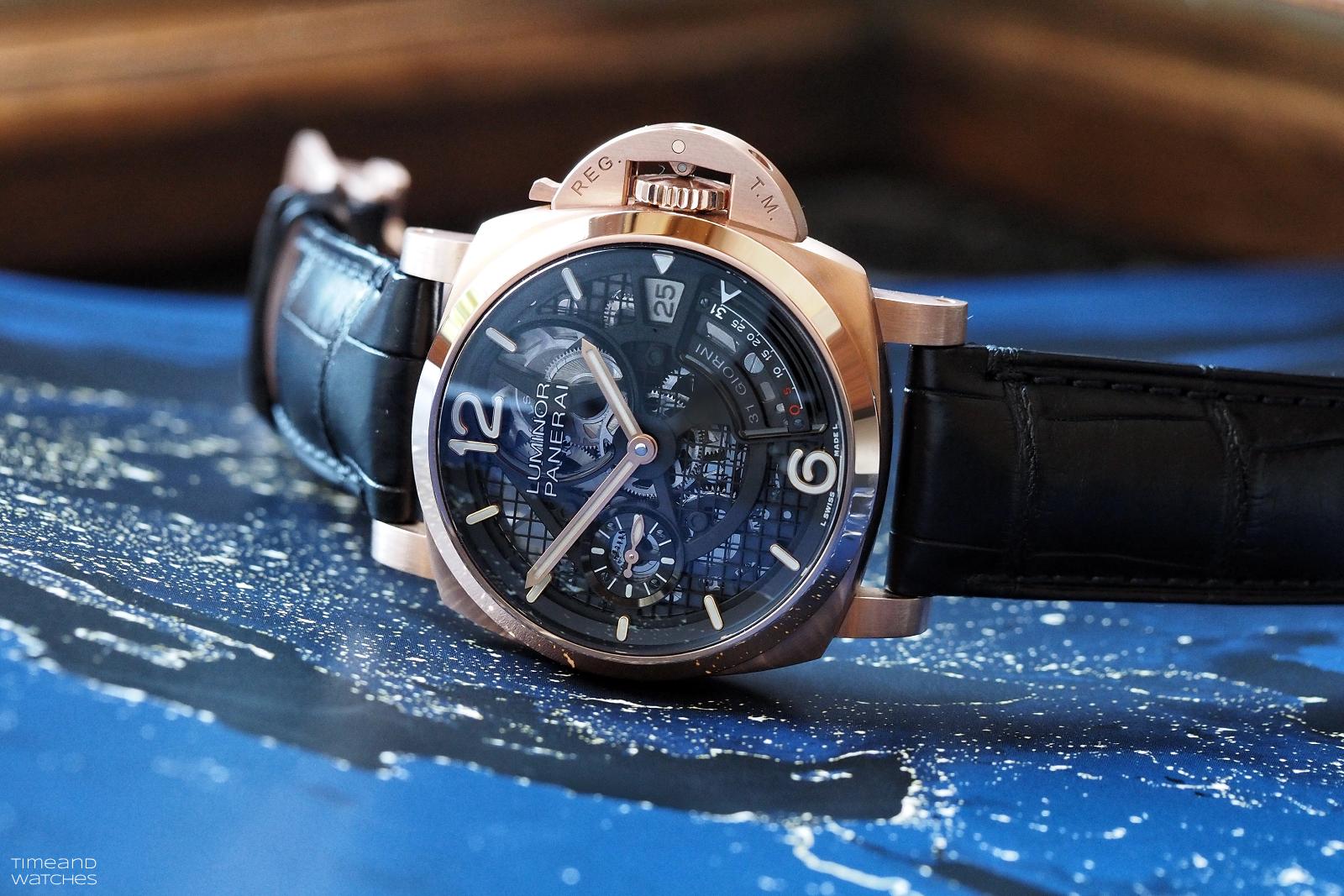 The dial, such as it is, shows the architecture directly. The barrels dominate the left side. The going train runs across the centre. The Luminor sandwich construction has been retained only for the numerals at twelve and six and the applied hour markers, which glow with Super-LumiNova. Gear Patrol, hands-on in Geneva, described the result as "a Luminor you read through," and noted that the skeletonisation is clean enough that the hour and minute hands remain the first things the eye finds.