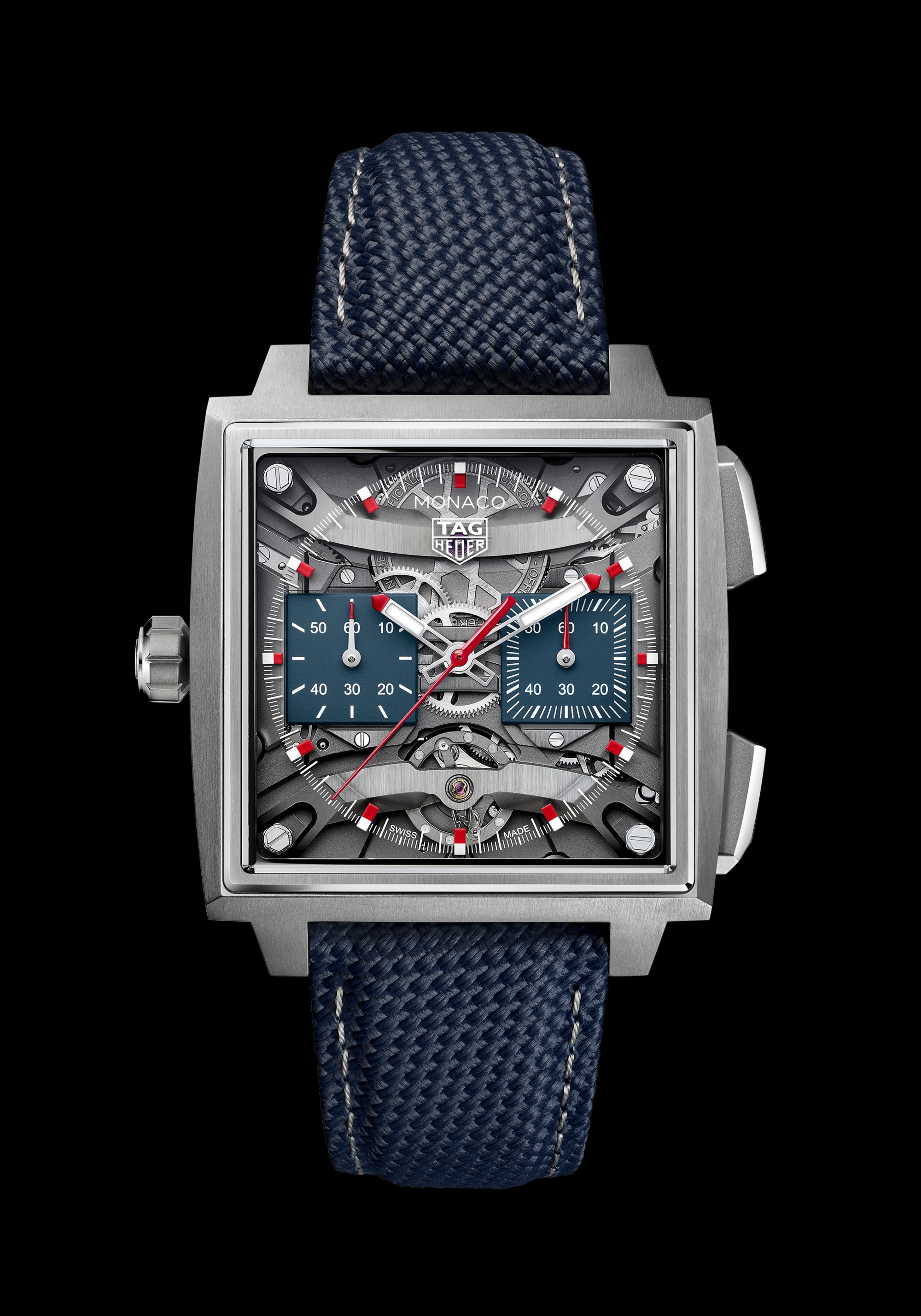 The case is a 40mm Monaco in Grade 5 titanium. Two versions launch: natural titanium with blue opaline chronograph counters and red accents on the hands, and a black DLC-coated version with darker counters. The reference cited here, CEW5181.FT8123, is the natural titanium configuration on a blue textured rubber strap.
